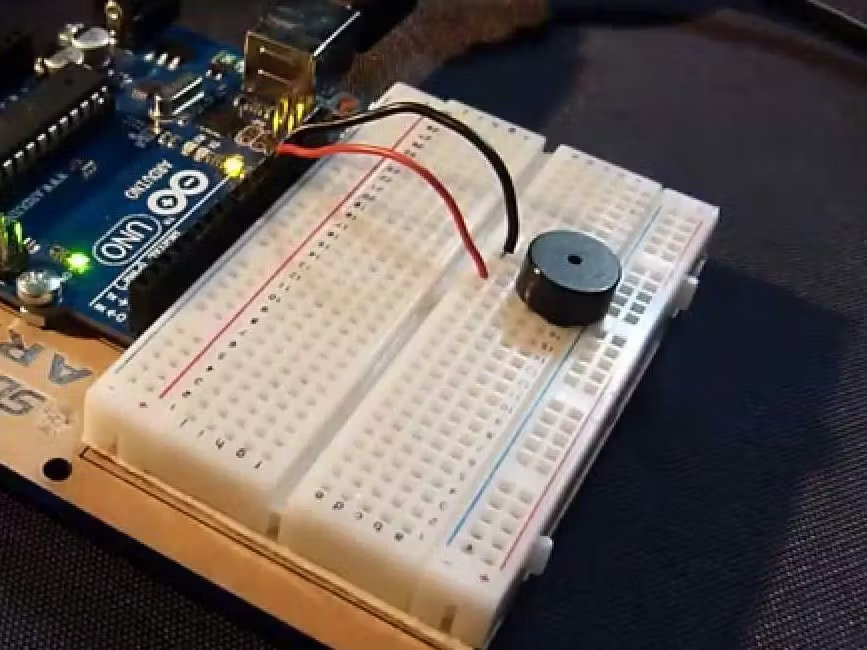 Sebenarnya, kamu bisa saja tidak menggunakan resistor 1 k ohm. Jika kamu menghubungkannya tanpa resistor, buzzer akan berbunyi jauh lebih keras, namun kualitas suaranya bisa menurun. Kamu juga bisa menurunkan nilai resistansi untuk mendapatkan suara yang sedikit lebih keras sambil tetap menjaga kualitas suara. Ide lainnya adalah menggunakan potensiometer sebagai pengganti resistor untuk berfungsi sebagai pengatur volume. Untuk tutorial ini, kita hanya akan menggunakan resistor 1 k ohm.