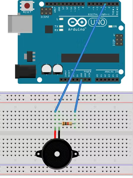 Jadi pada dasarnya, buzzer, resistor 1 k ohm, dan Arduino harus dihubungkan seperti berikut:
