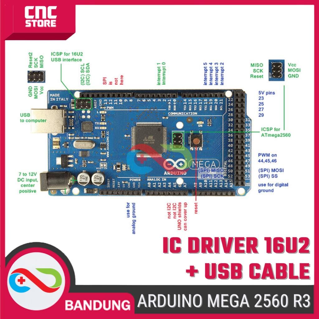 Selain memiliki 54 pin digital input/output (dimana 15 diantaranya bisa digunakan sebagai output PWM), board ini dilengkapi juga dengan 4 UART (serial port hardware), crystal osilator 16MHz, koneksi USB, power jack, header ISP, dan tombol reset. Cukup hubungkan MEGA 2560 dengan komputer via kabel USB, agan bisa langsung ngoprek.