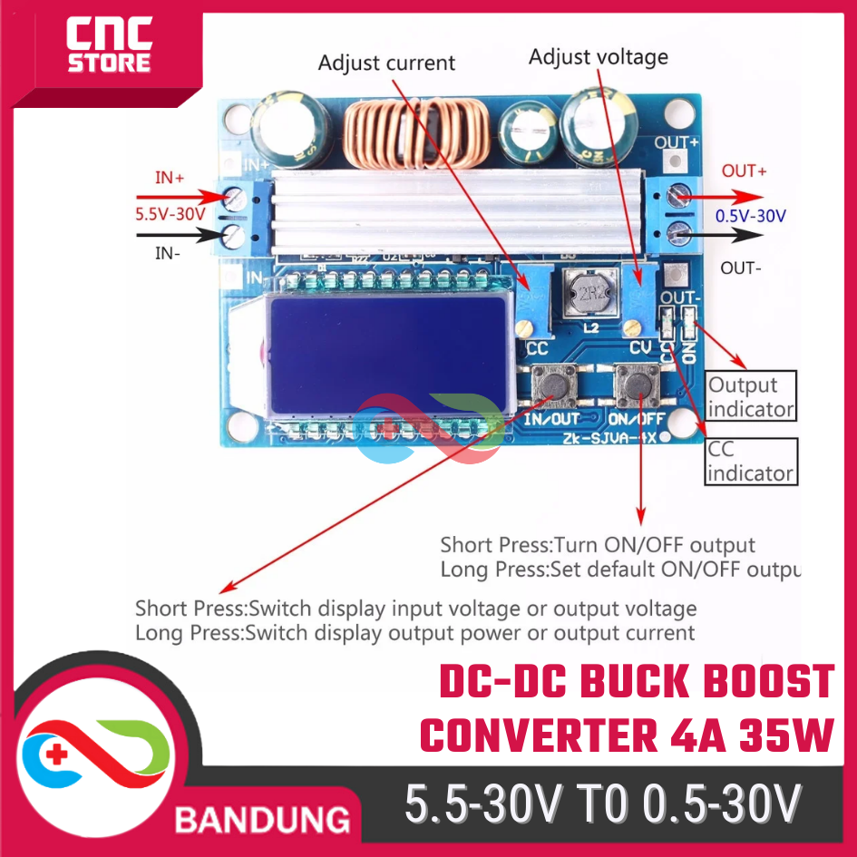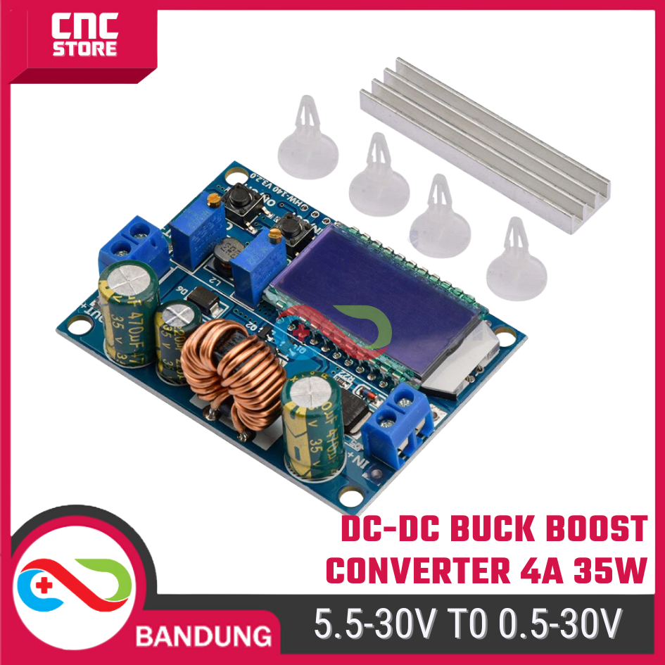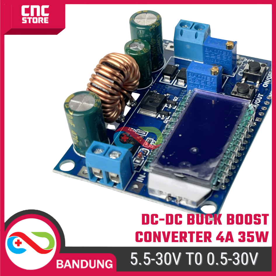 DC-DC Buck Boost Converter 5.5–30V to 0.5–30V 4A 35W – Adjustable Step Up / Step Down dengan LCD Volt & Amp Meter