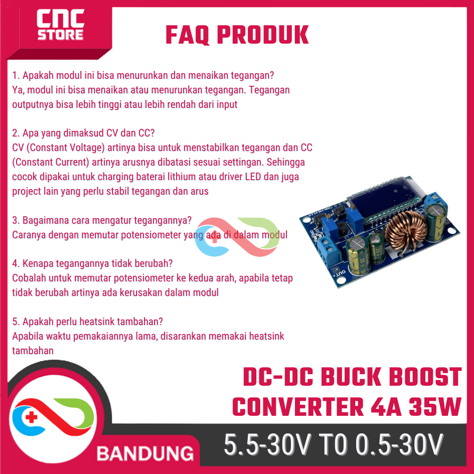 + Arus Output Maksimal: 4A (maksimal, dengan pendinginan baik), disarankan maks 3A.