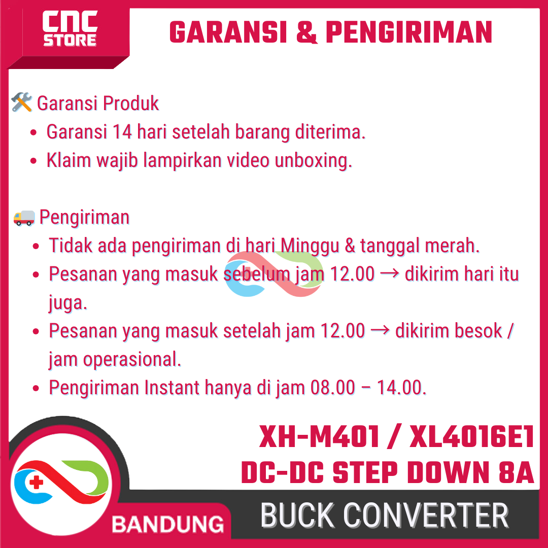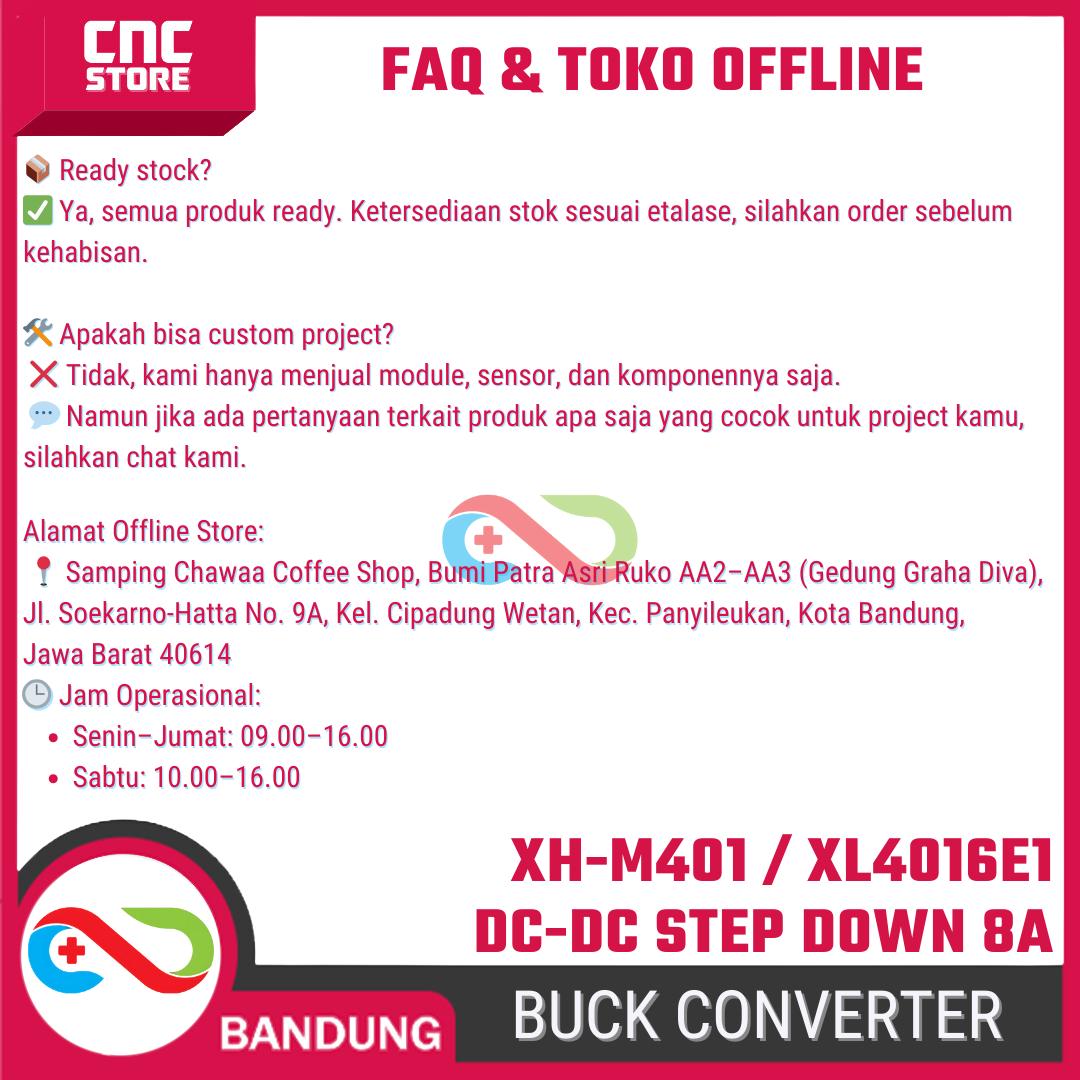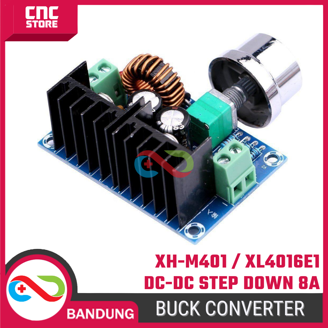 Modul XH-M401 / XL4016E1 adalah buck converter high-power dengan kemampuan input lebar 4–40V dan output adjustable 1.25–36V hingga 8A.