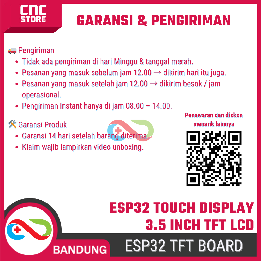 Board ini cocok untuk aplikasi IoT yang membutuhkan tampilan visual dan input sentuhan, seperti dashboard, kontrol panel, smart device, dan HMI mini. Tidak perlu modul tambahan, wiring jadi lebih rapi dan ringkas.
