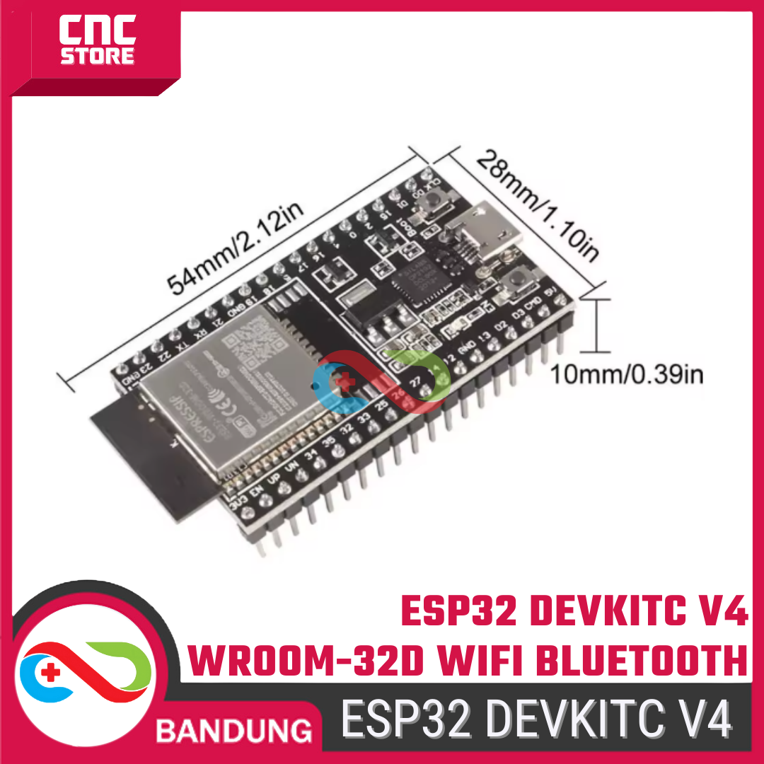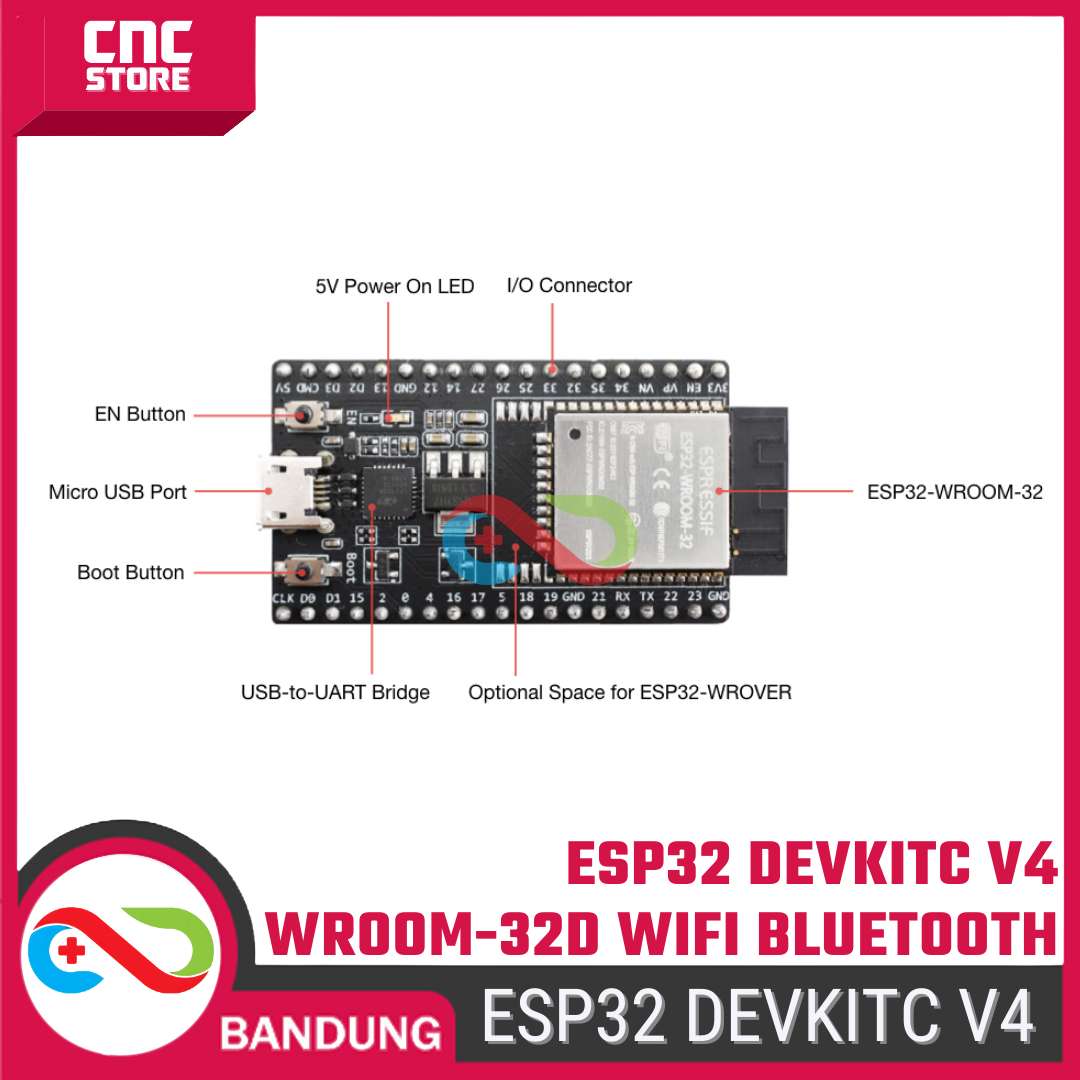 ESP32 DEVKITC V4 WROOM-32D adalah board pengembangan resmi berbasis chip ESP-WROOM-32D, yang sudah dilengkapi WiFi + Bluetooth dan prosesor dual-core.