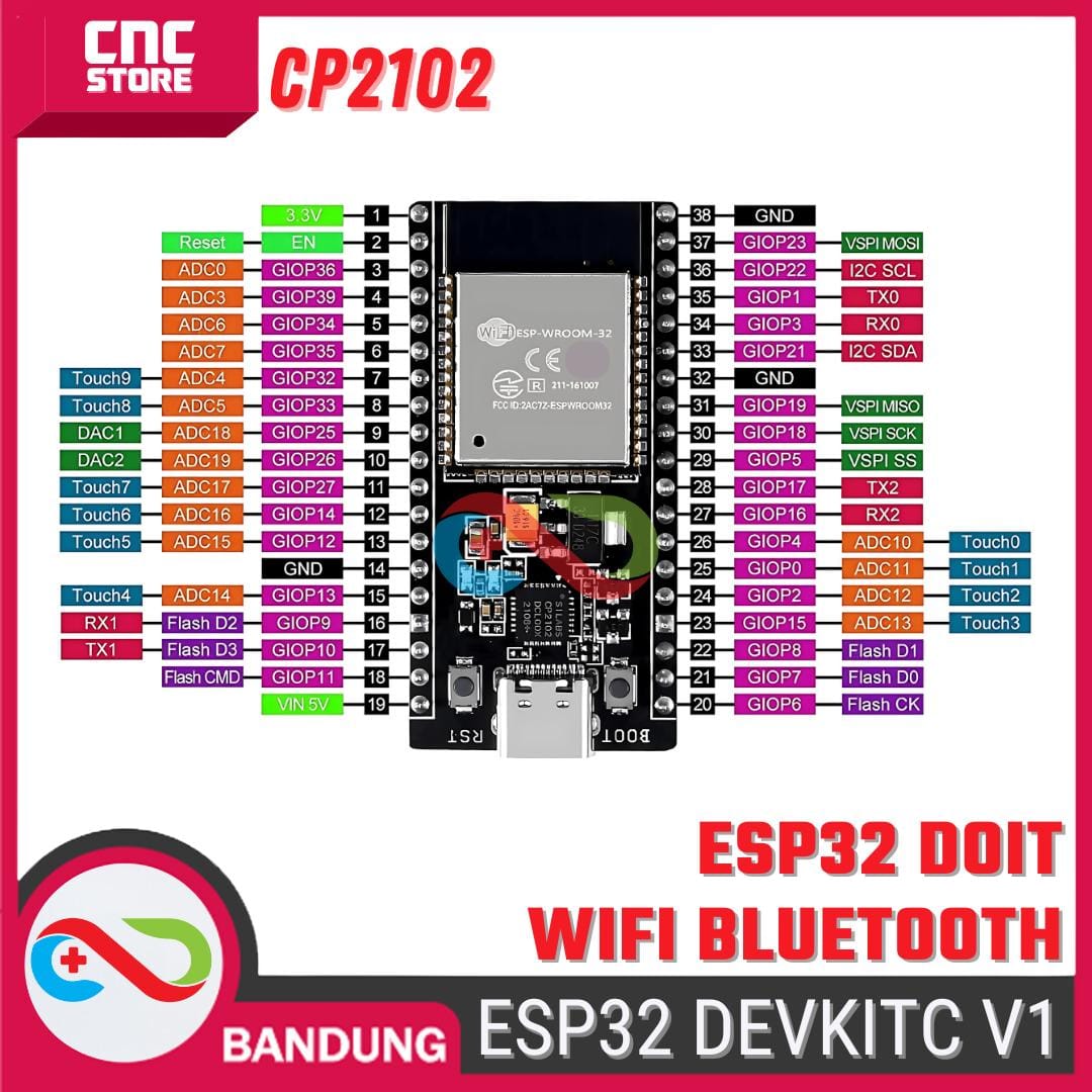 Board ini menggunakan chip ESP32-WROOM-32 dengan dual-core 32-bit Xtensa processor, kecepatan hingga 240MHz, serta dilengkapi WiFi dan Bluetooth bawaan.