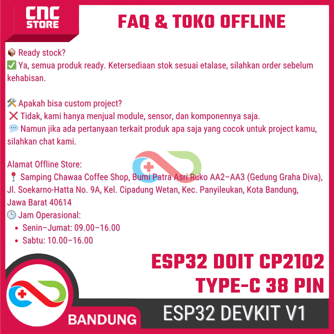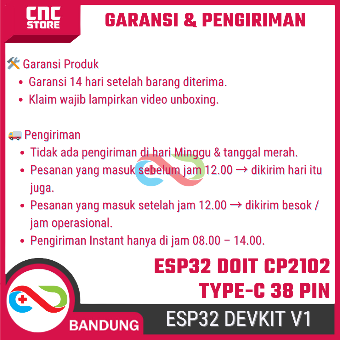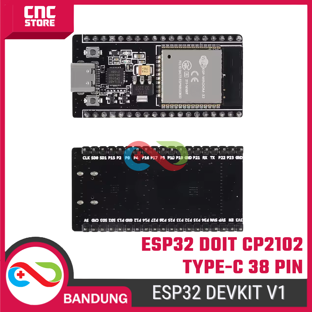 Dibekali chip CP2102 untuk koneksi USB yang stabil dan port Type-C modern, board ini memudahkan kamu upload program tanpa ribet. Dengan 38 pin I/O multifungsi, kecepatan hingga 240MHz, dan memori besar, ESP32 cocok untuk semua proyek: mulai dari IoT monitoring, smart home, robotik, data logger, hingga automasi sistem pintar.