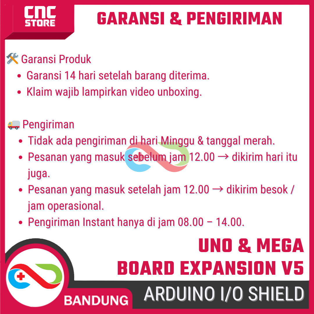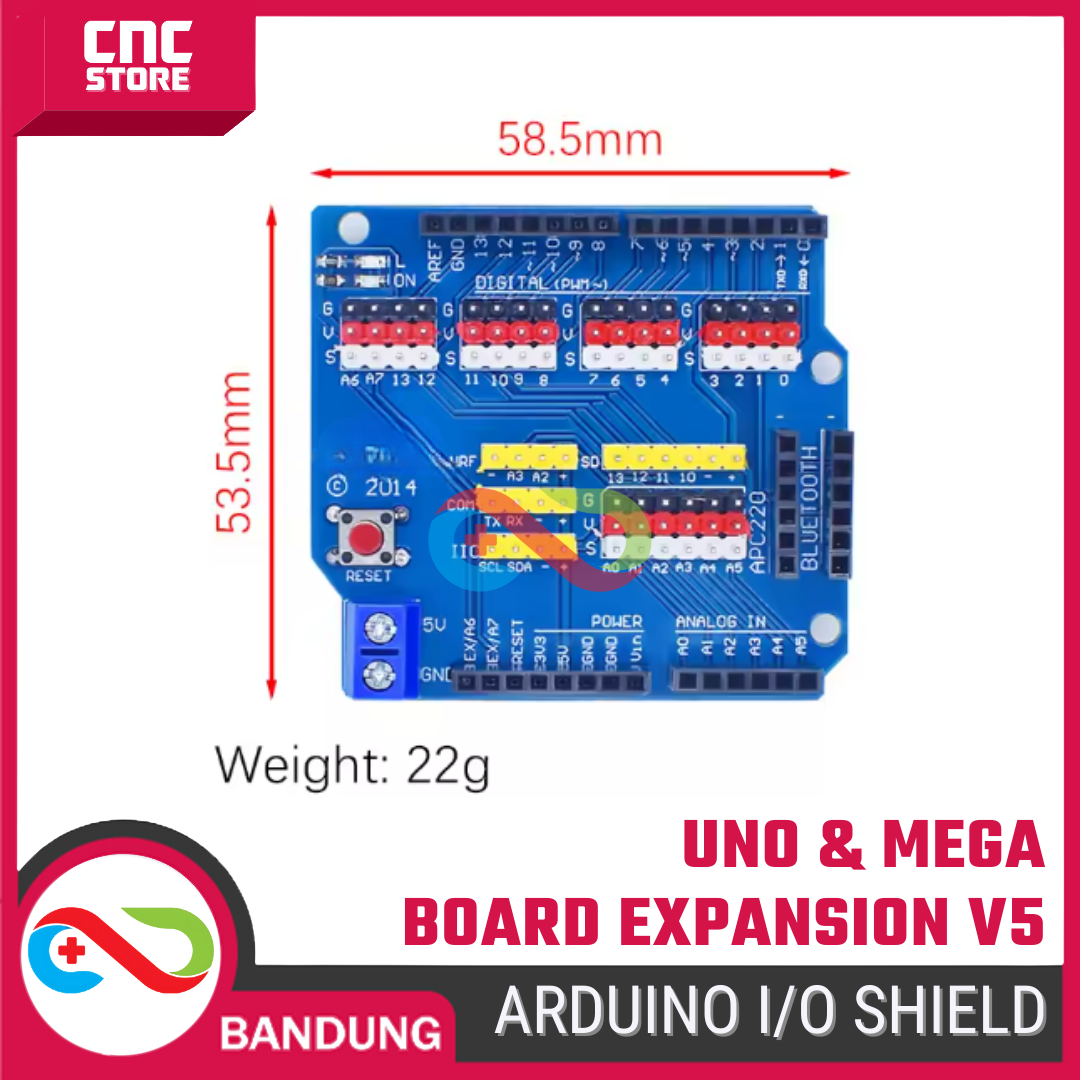 Expansion Shield V5.0 adalah papan ekspansi serbaguna untuk Arduino UNO R3 dan MEGA, dilengkapi pinout sensor lengkap, power rail 5V/3.3V, tombol pushbutton, potensiometer, dan header standar 3-pin untuk servo/sensor (VCC–GND–SIGNAL).