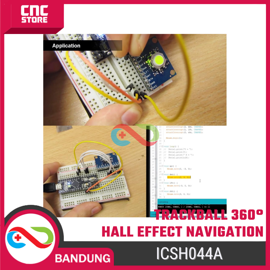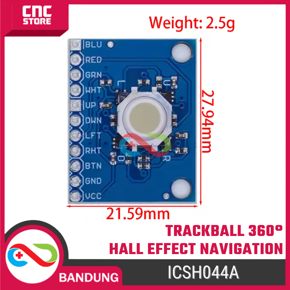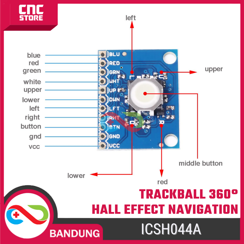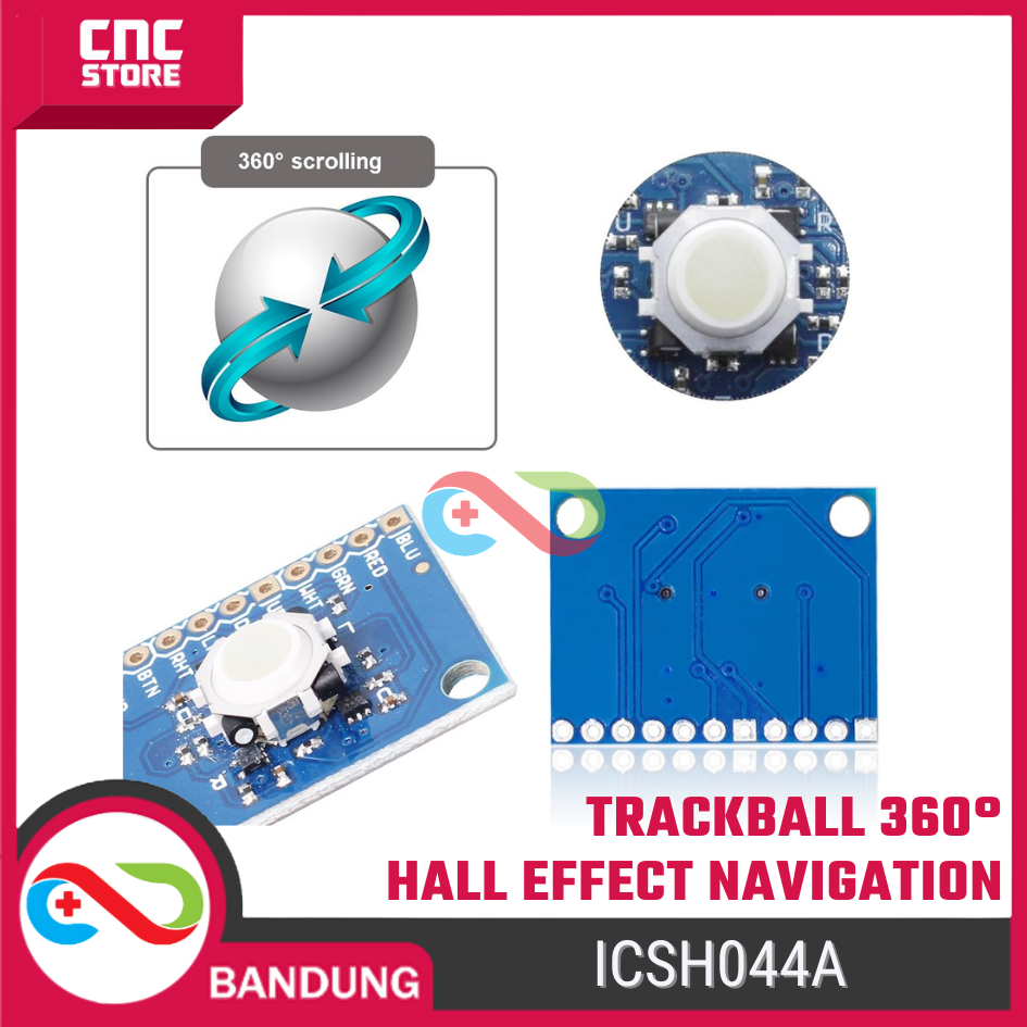 ICSH044A adalah breakout board untuk modul trackball berbasis Hall Effect. Modul ini mampu mendeteksi pergerakan 360° (atas, bawah, kiri, kanan) serta klik tombol (push button). Berbeda dengan joystick potensiometer, modul ini menggunakan sensor magnetik (Hall sensor) sehingga lebih tahan aus dan responsif.