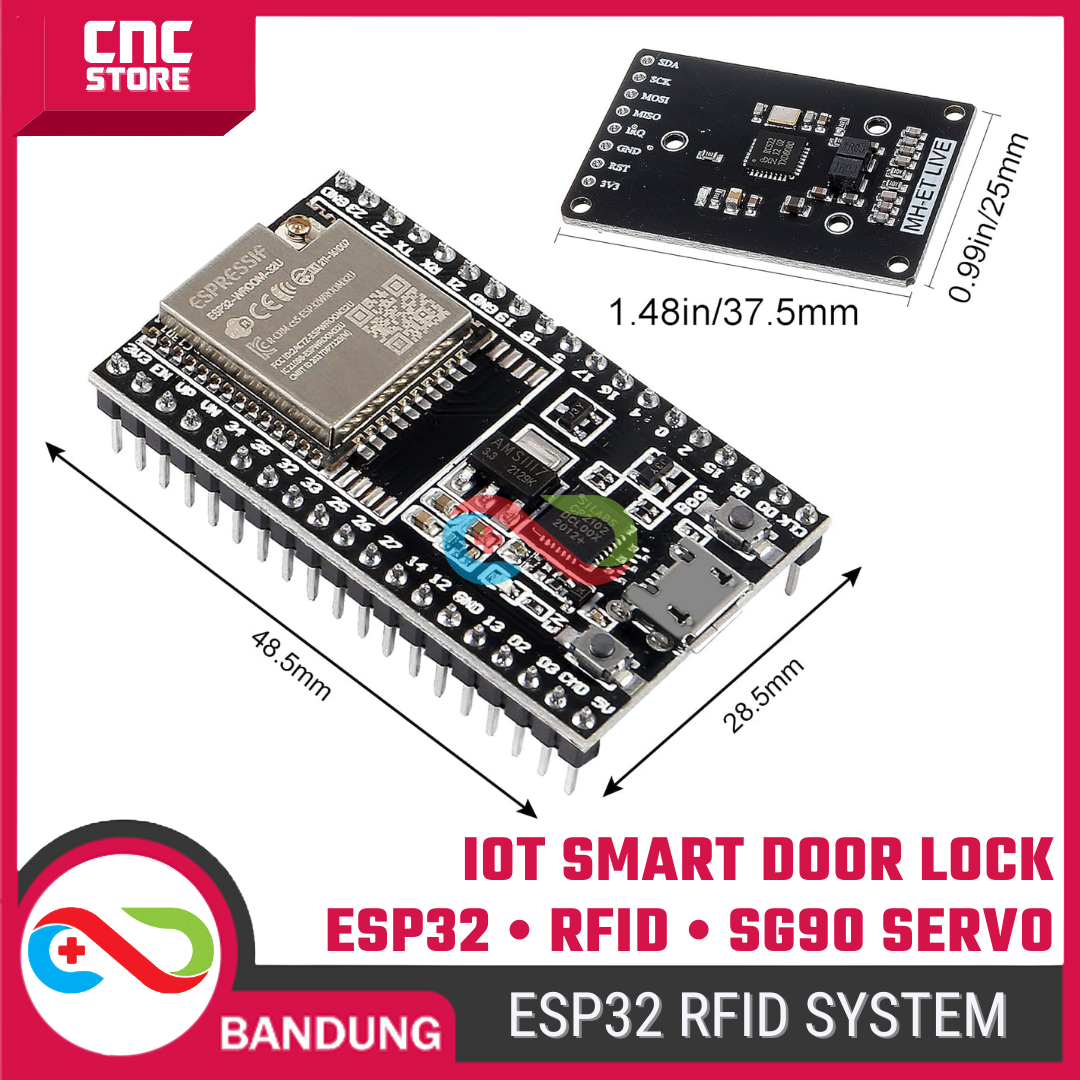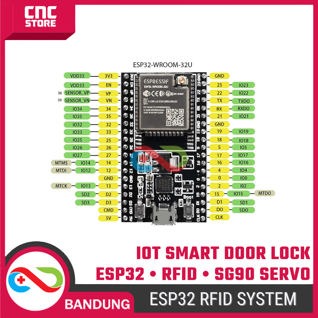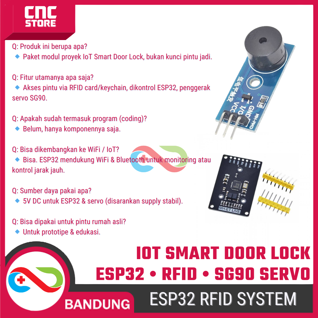 IoT Smart Door Lock ESP32 adalah paket komponen proyek DIY yang dirancang untuk membuat sistem kunci pintu berbasis RFID menggunakan ESP32 sebagai otak utama.