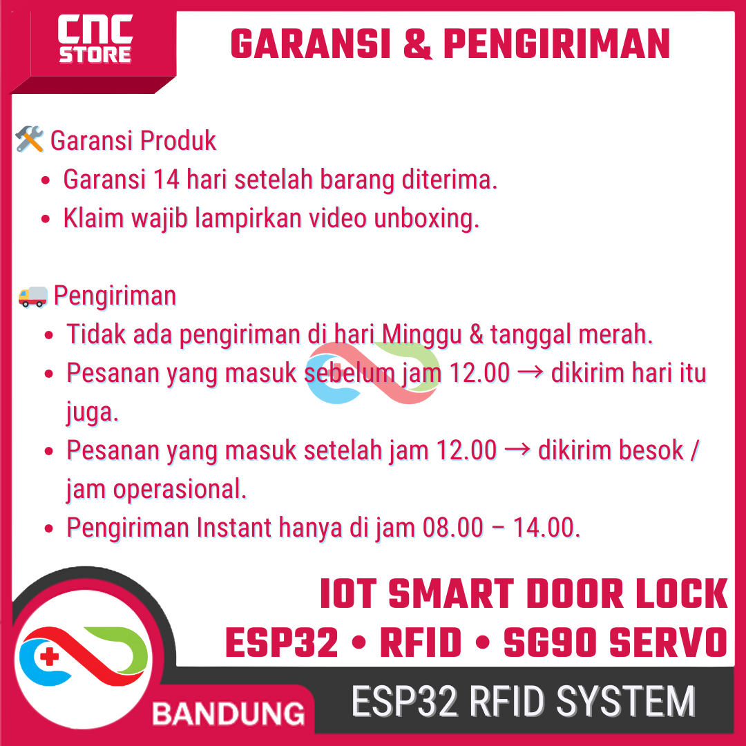 Paket IoT Smart Door Lock ESP32 ini cocok buat belajar akses kontrol RFID, logika keamanan, dan aktuator mekanik sederhana.