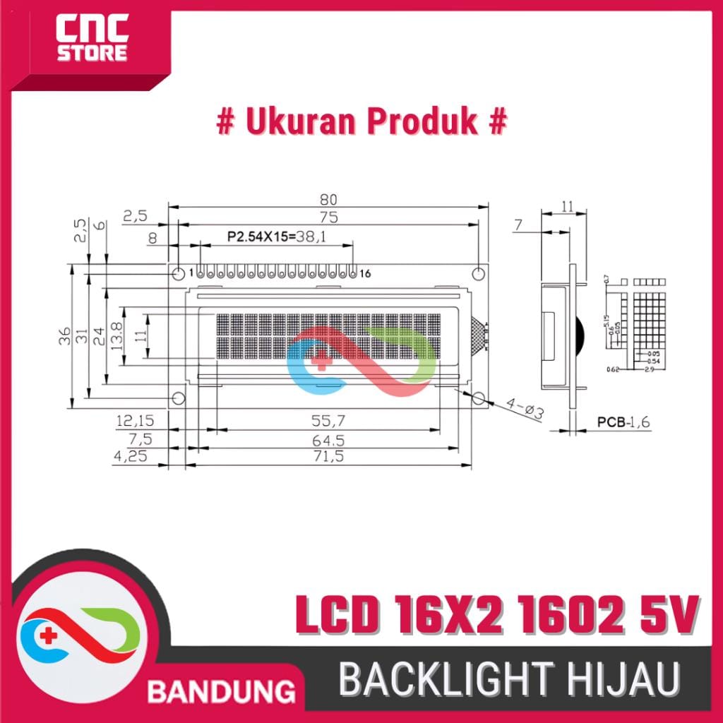 LCD Character 16×2 ini solusi sempurna untuk menampilkan data pada proyek elektronik kamu. Dengan backlight hijau yang cerah, layar ini memungkinkan visualisasi data secara jelas dan mudah dalam projek IoT, monitoring sensor, atau proyek berbasis Arduino.