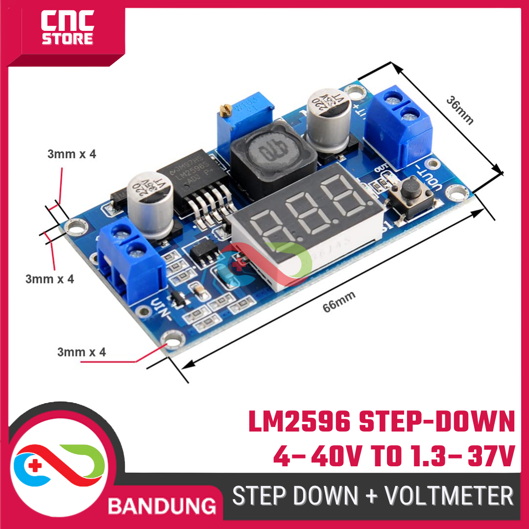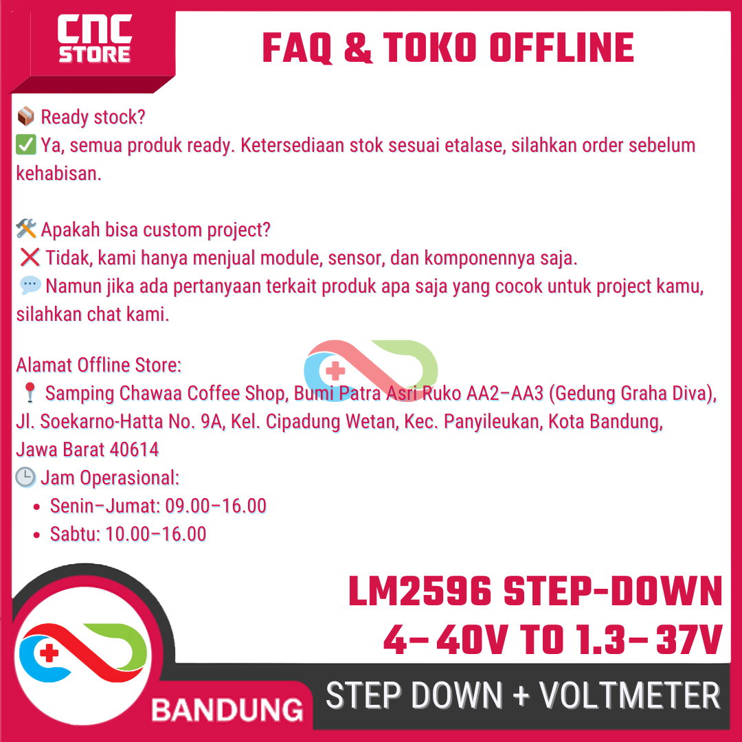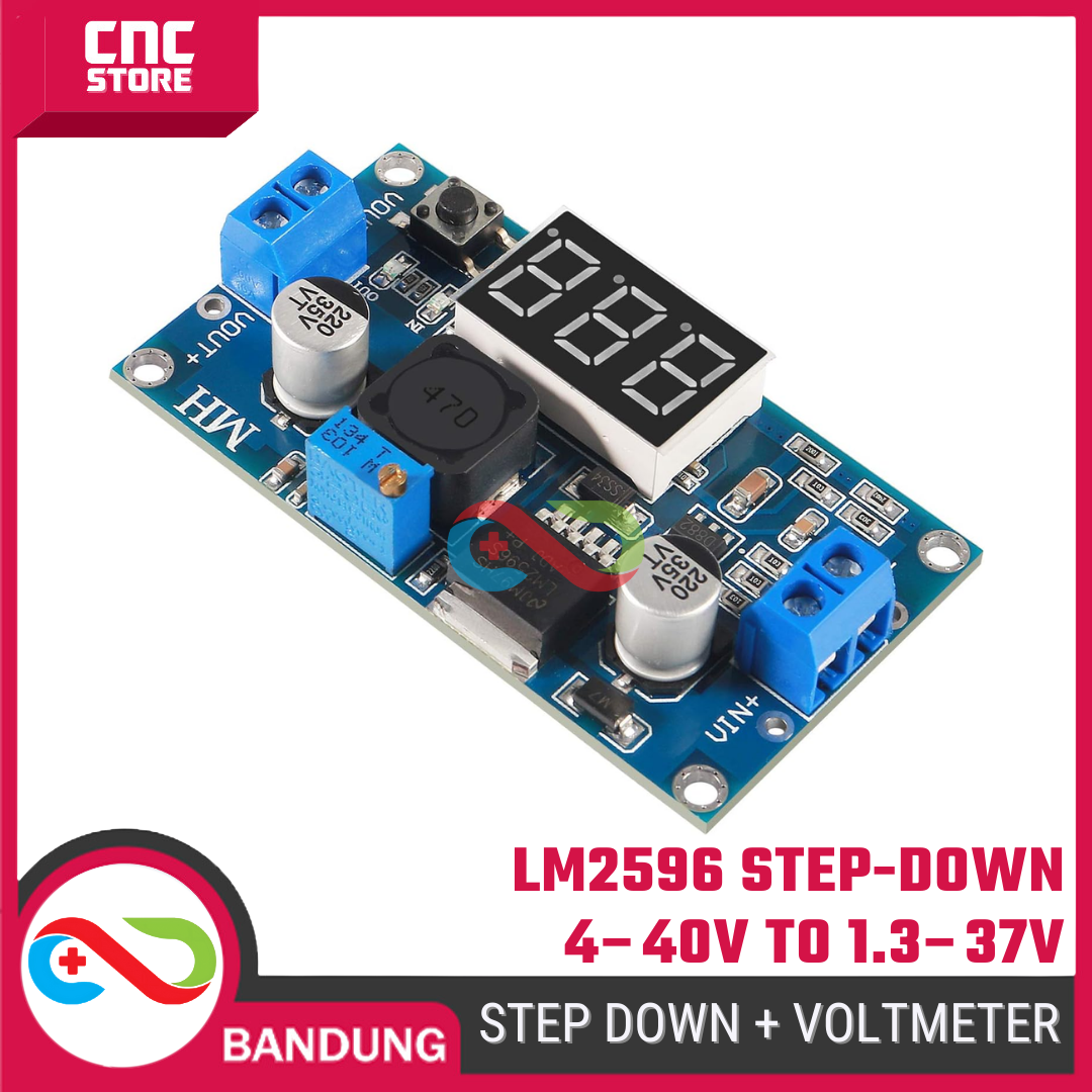 Module Step Down (Buck Converter) LM2596 + LED Voltmeter ini berfungsi untuk menurunkan tegangan DC dari 4–40V menjadi 1.3–37V sesuai kebutuhan.