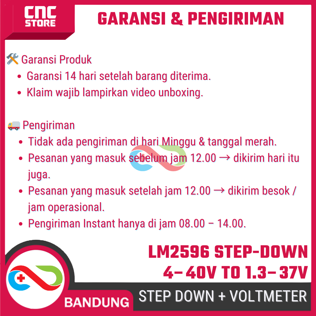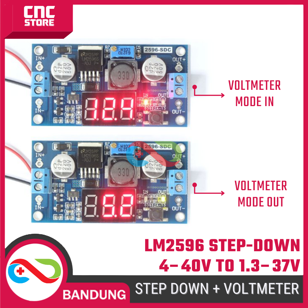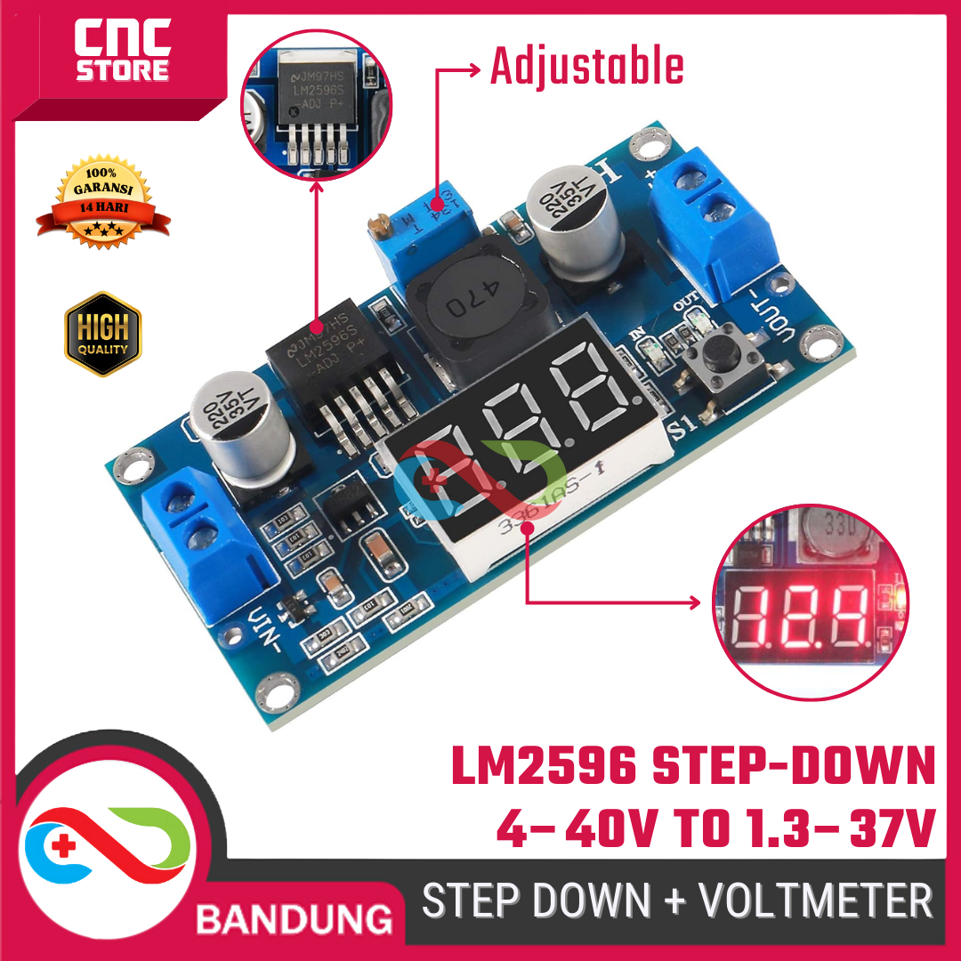 Module Step Down (Buck Converter) LM2596 + LED Voltmeter ini berfungsi untuk menurunkan tegangan DC dari 4–40V menjadi 1.3–37V sesuai kebutuhan.