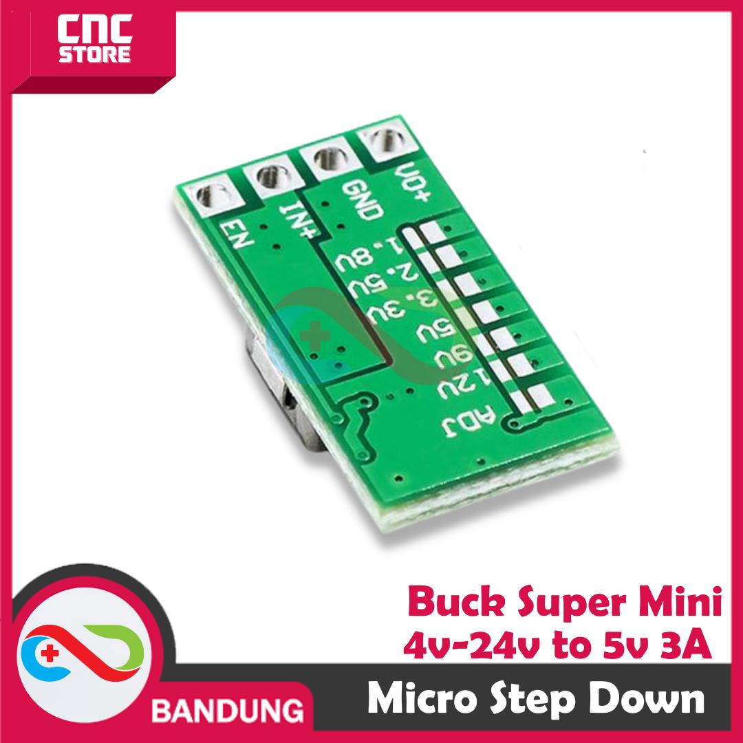 Merupakan modul stepdown berukuran kecil yang praktis di gunakan. Dapat digunakan sebagai variable stepdown (pengaturan melalui potentio) atau fixed output (dengan menyolder bagian belakang board)