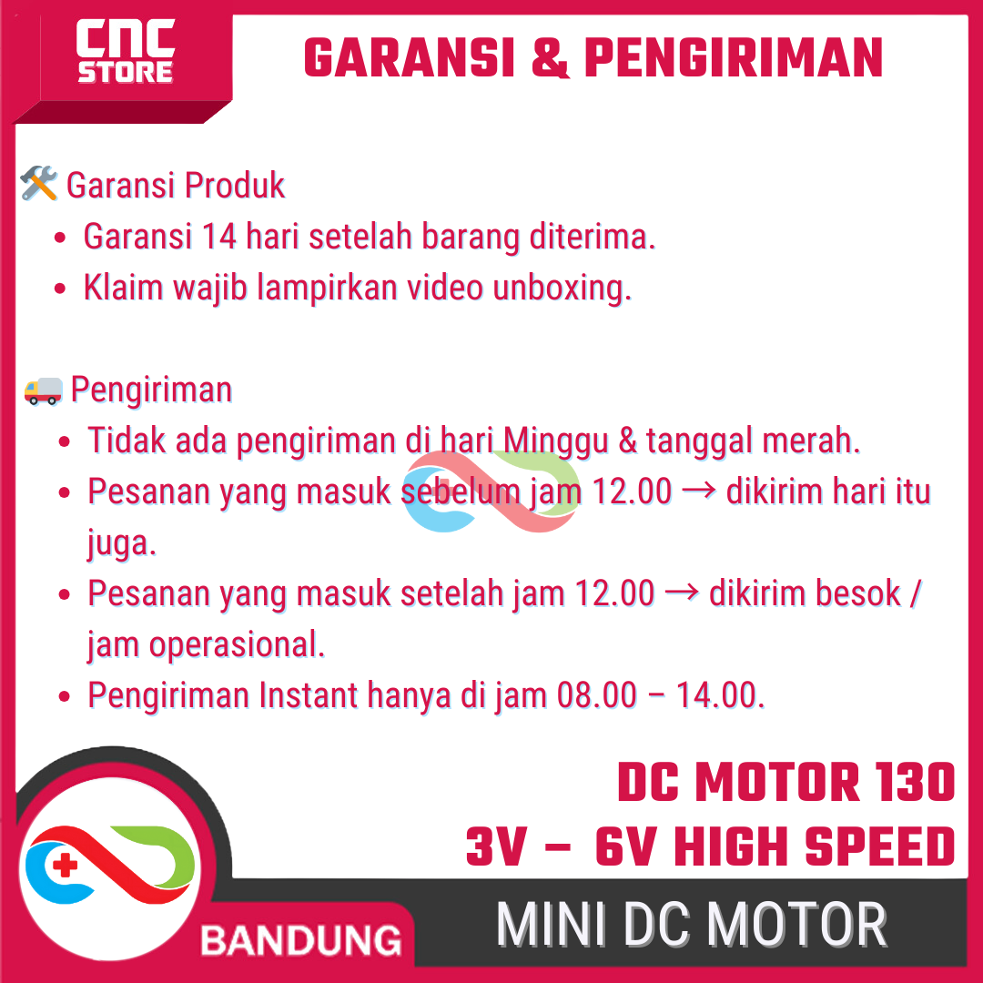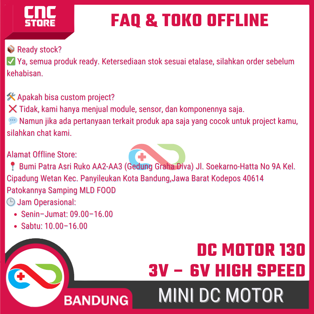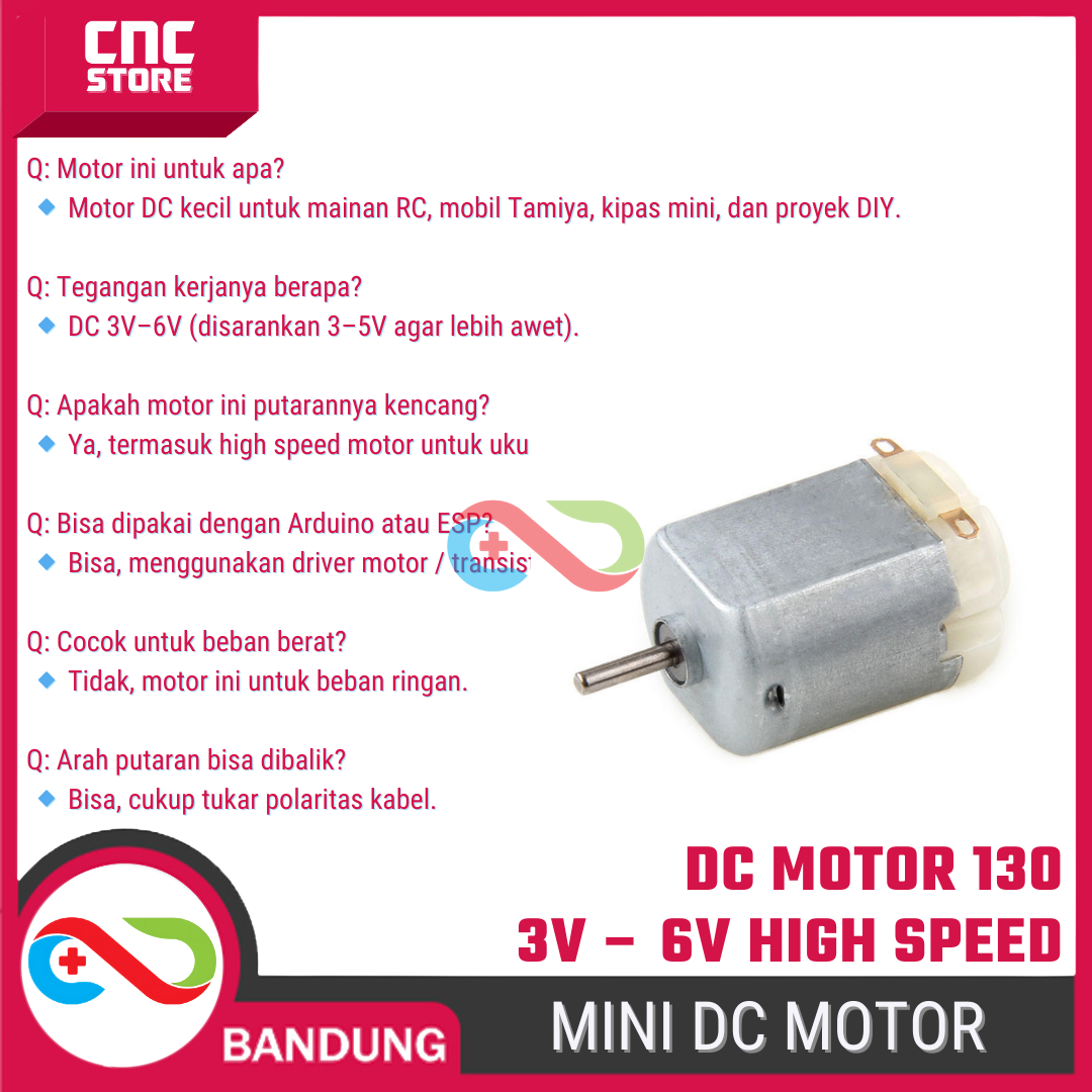 Ukuran kecil, konsumsi daya rendah, tapi putaran tinggi. Cocok buat praktek dasar elektronika & mekanik, juga buat upgrade mainan biar larinya lebih kencang.