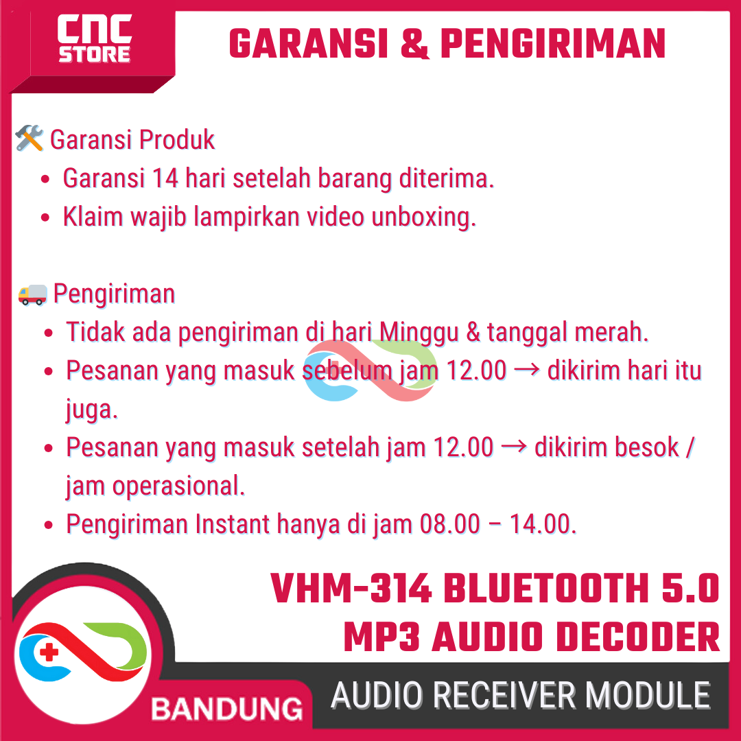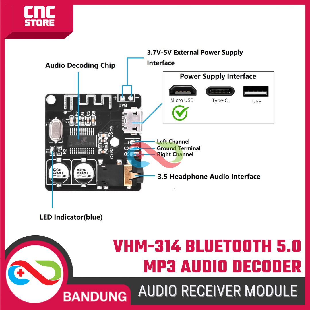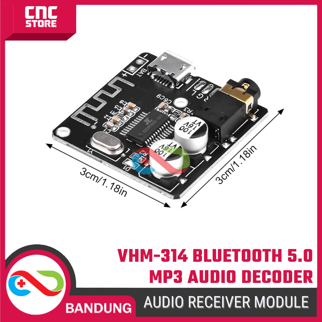 VHM-314 adalah modul Bluetooth 5.0 audio receiver berkualitas tinggi yang berfungsi sebagai penerima musik dari smartphone ke perangkat audio seperti amplifier, speaker aktif, atau headphone amplifier.