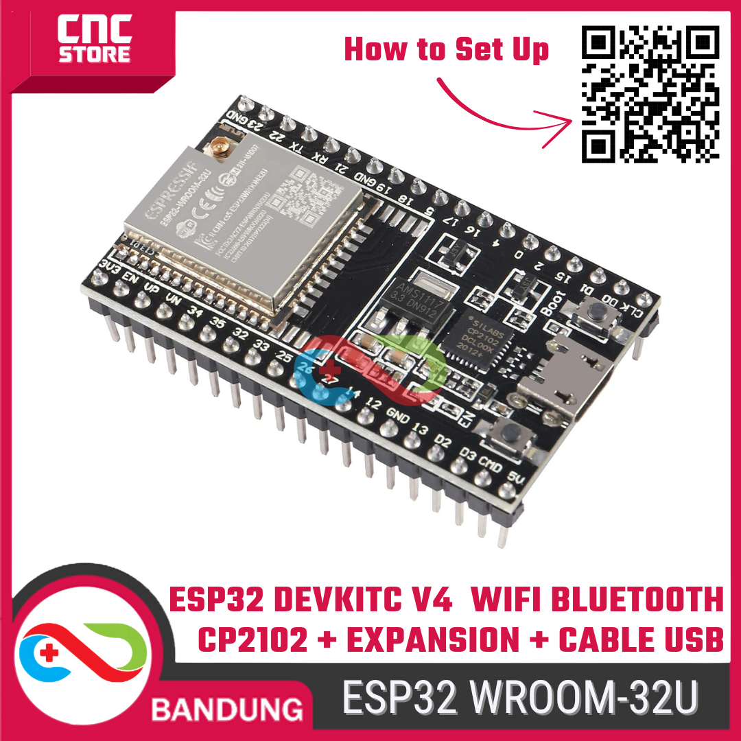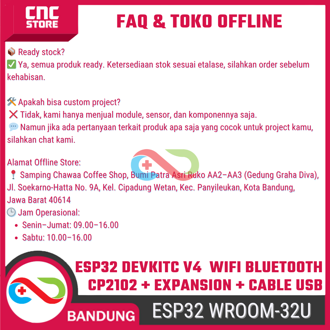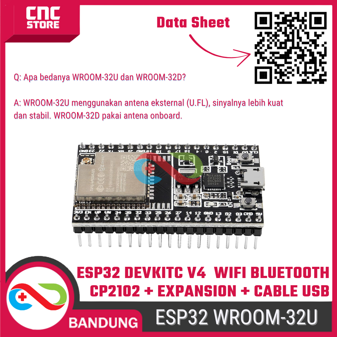 Bedanya dengan versi WROOM-32D, varian WROOM-32U punya konektor antena eksternal (U.FL) — sinyalnya jauh lebih kuat dan stabil, ideal untuk proyek jarak jauh atau outdoor. Paket ini udah termasuk kabel USB untuk pemrograman + expansion module supaya kamu bisa langsung mulai eksperimen tanpa beli tambahan komponen lagi.