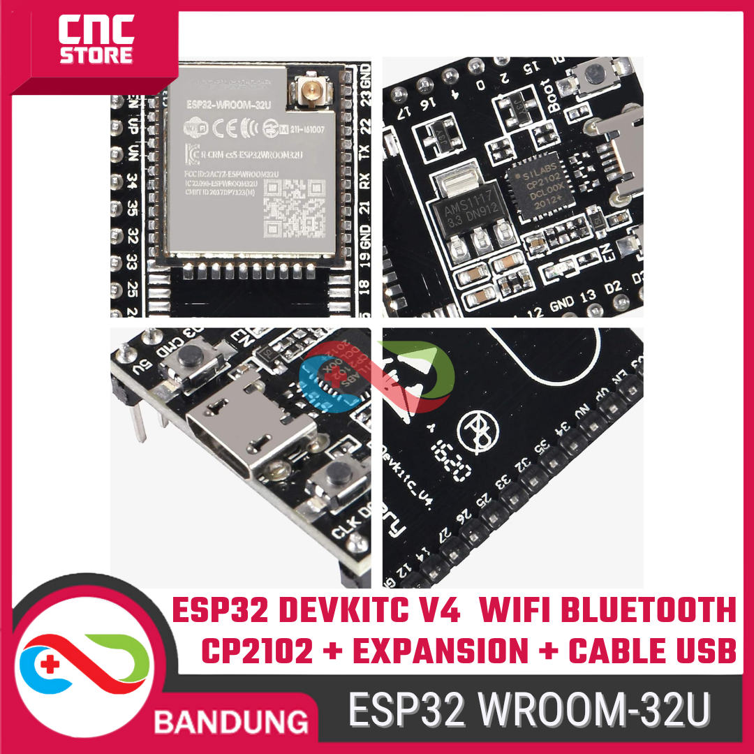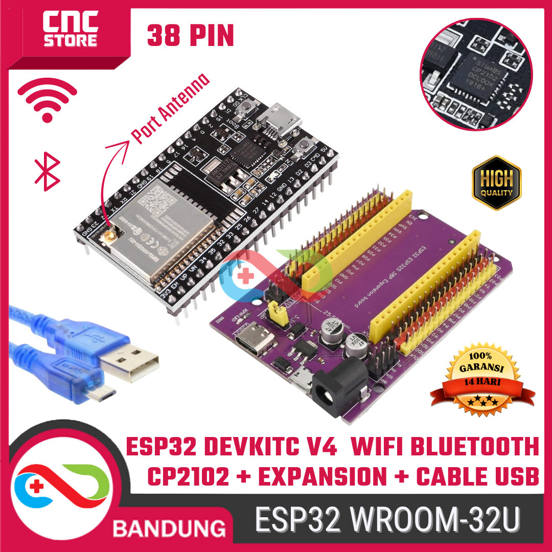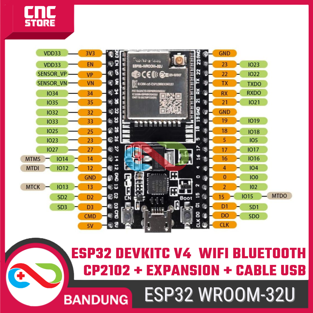 Bedanya dengan versi WROOM-32D, varian WROOM-32U punya konektor antena eksternal (U.FL) — sinyalnya jauh lebih kuat dan stabil, ideal untuk proyek jarak jauh atau outdoor. Paket ini udah termasuk kabel USB untuk pemrograman + expansion module supaya kamu bisa langsung mulai eksperimen tanpa beli tambahan komponen lagi.