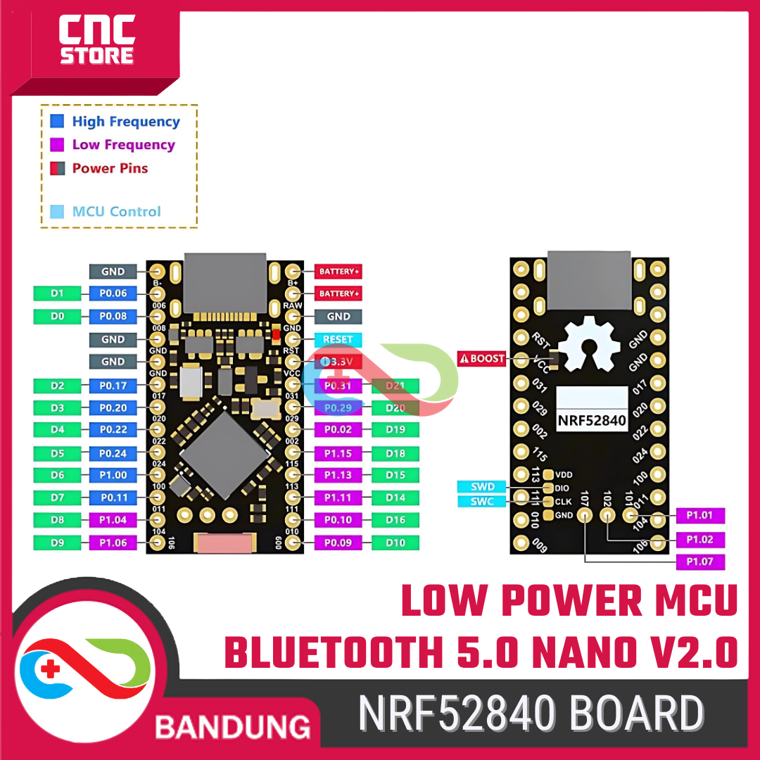– Chip: NRF52840 dengan prosesor ARM Cortex-M4F 32-bit