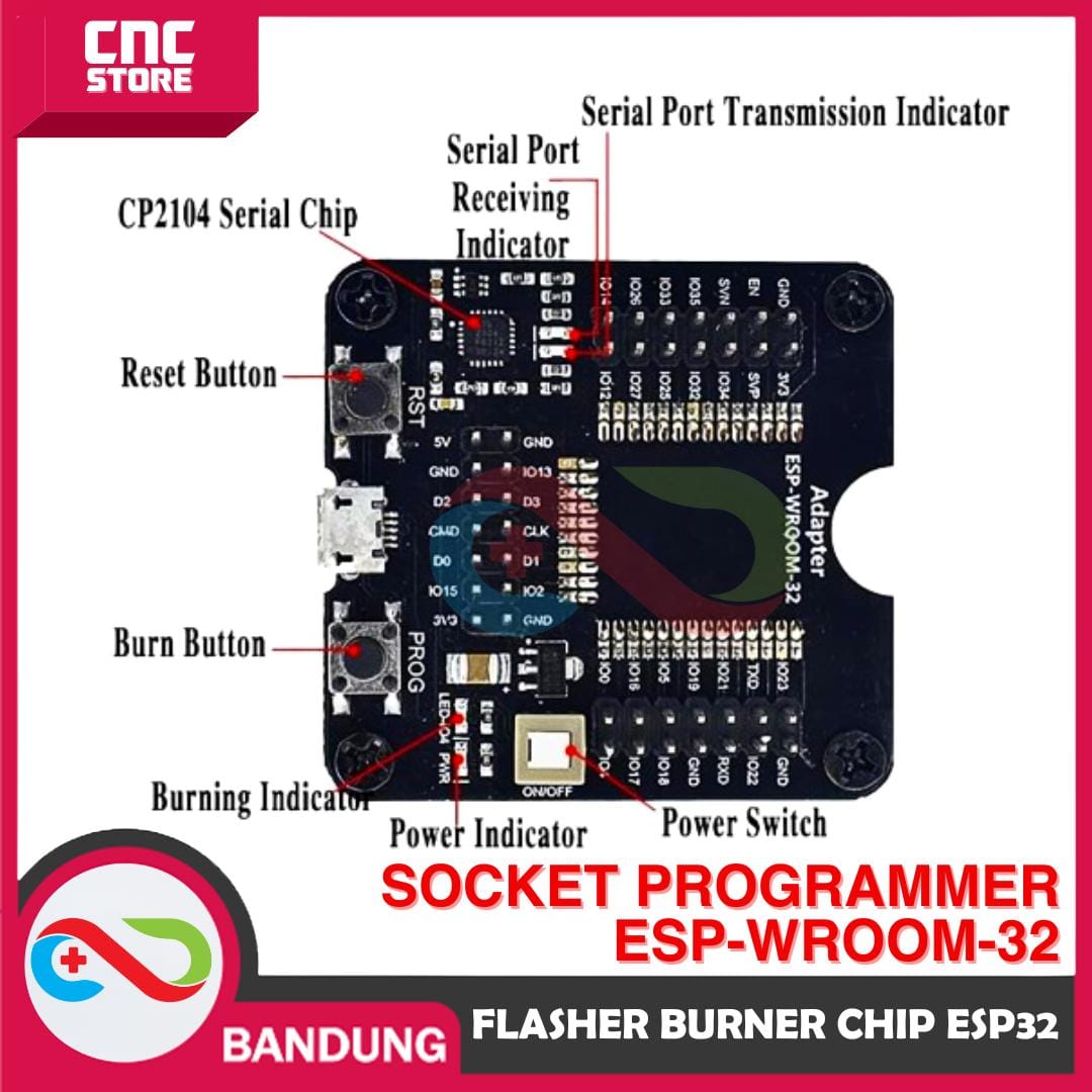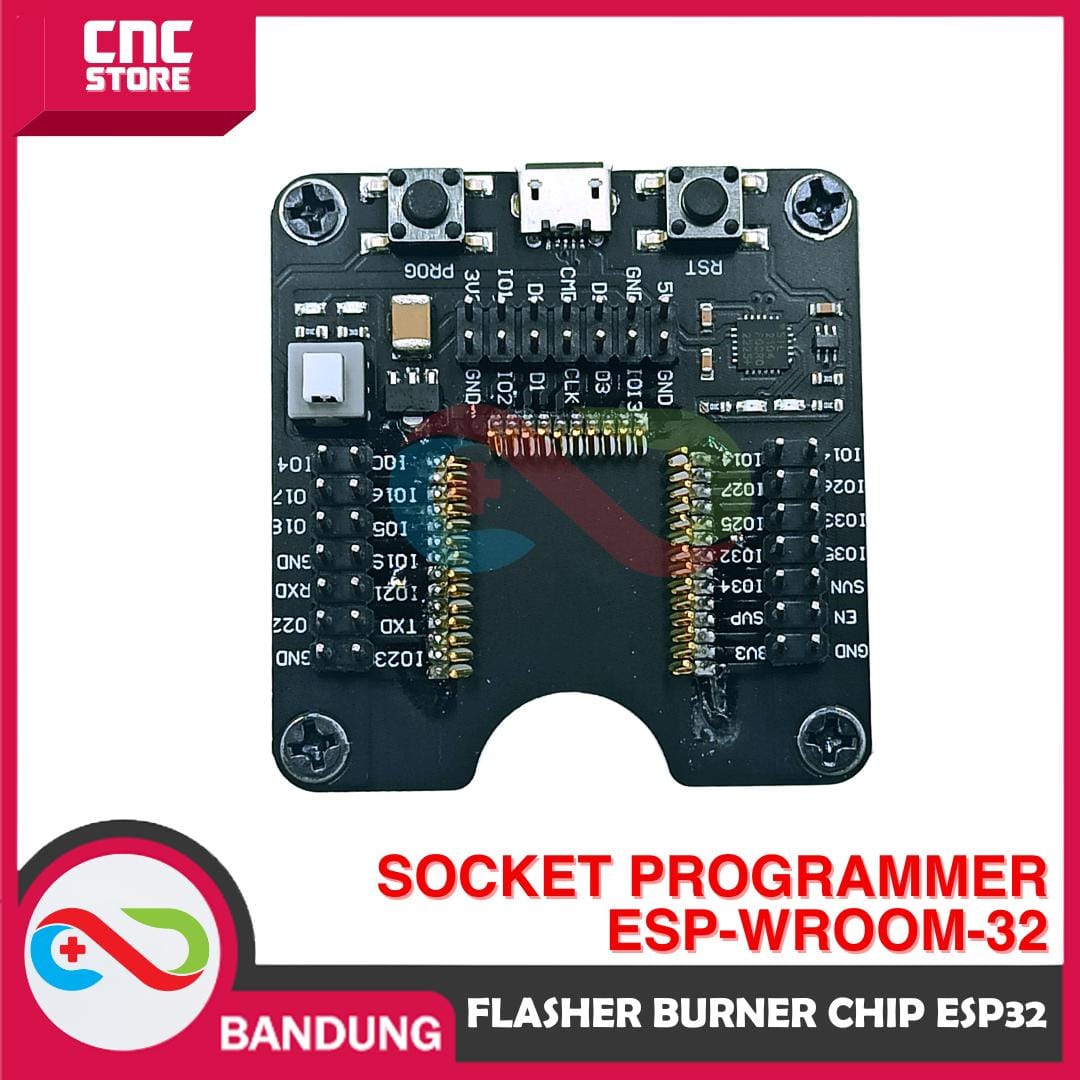 Socket Programmer Downloader Flasher Burner Chip ESP32 ESP-WROOM-32 adalah perangkat yang digunakan untuk memprogram dan mengisi firmware ke modul ESP32, khususnya modul ESP-WROOM-32. Perangkat ini berfungsi sebagai alat bantu yang memungkinkan Anda untuk menghubungkan modul ESP32 ke komputer Anda dan melakukan proses pemrograman atau pengisian ulang firmware dengan mudah.
