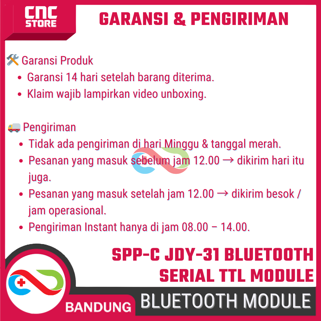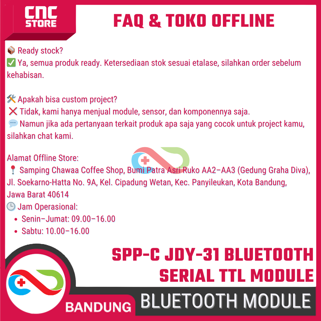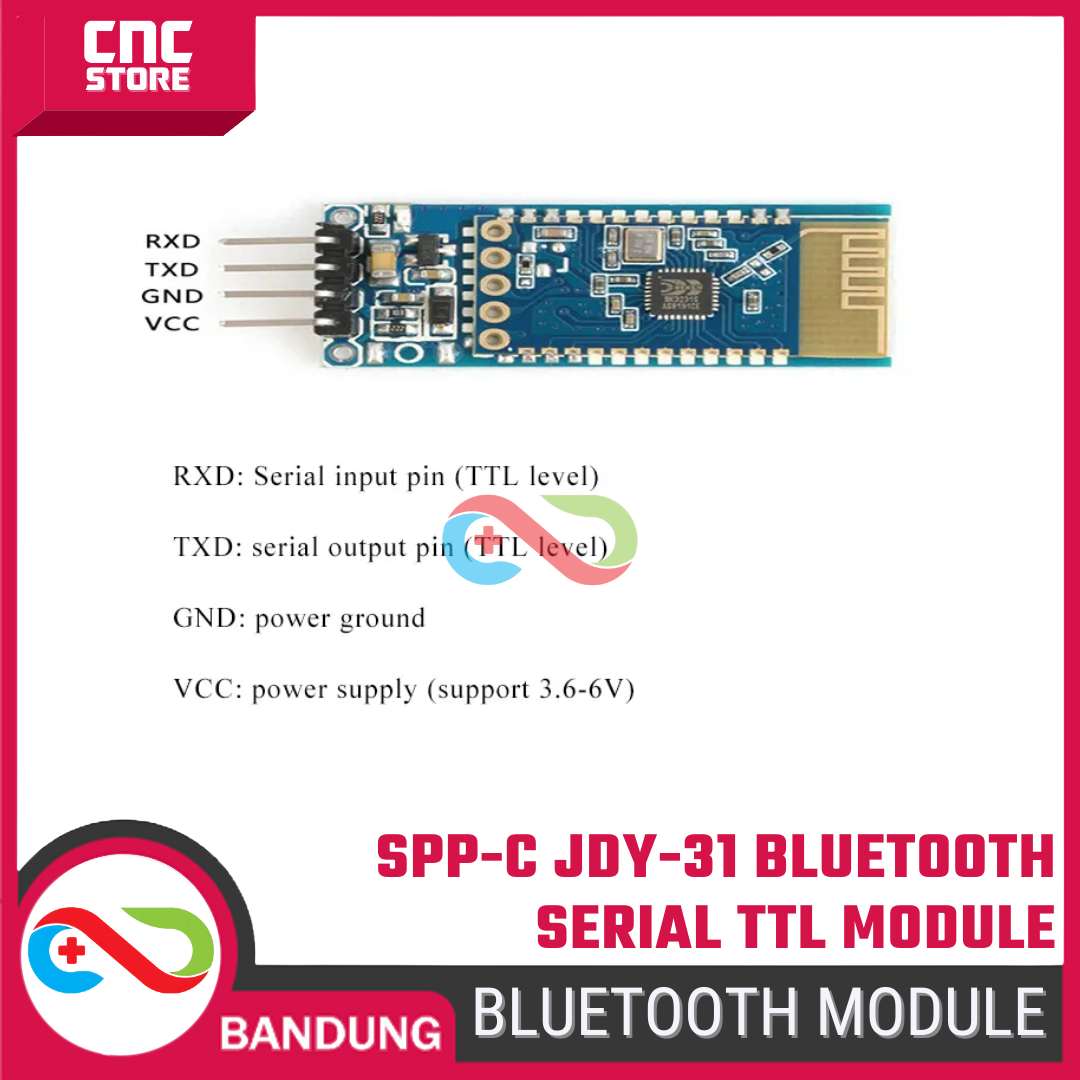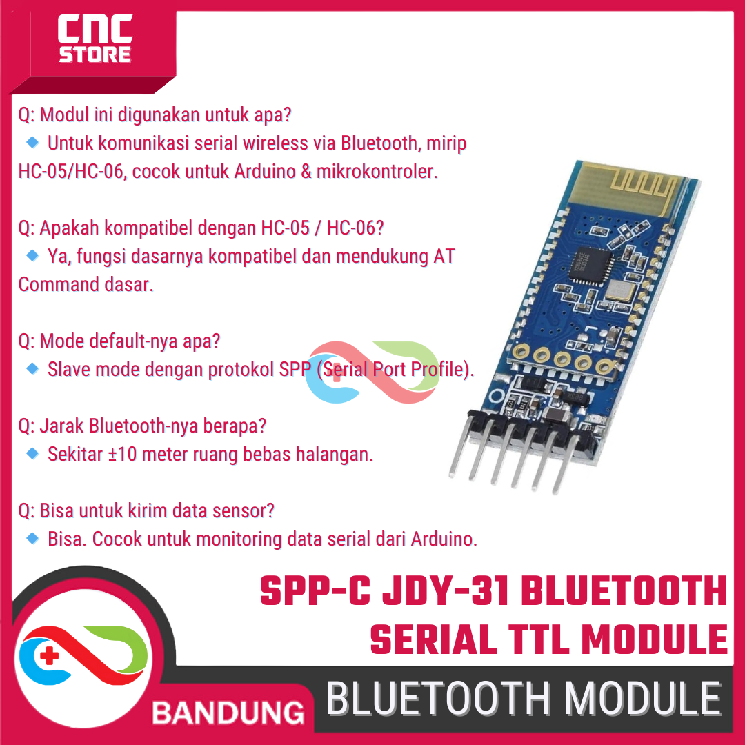 SPP-C JDY-31 adalah modul Bluetooth SPP (Serial Port Profile) yang berfungsi untuk komunikasi wireless dengan Arduino, ESP32, STM32, Raspberry Pi, dan mikrokontroler lainnya.