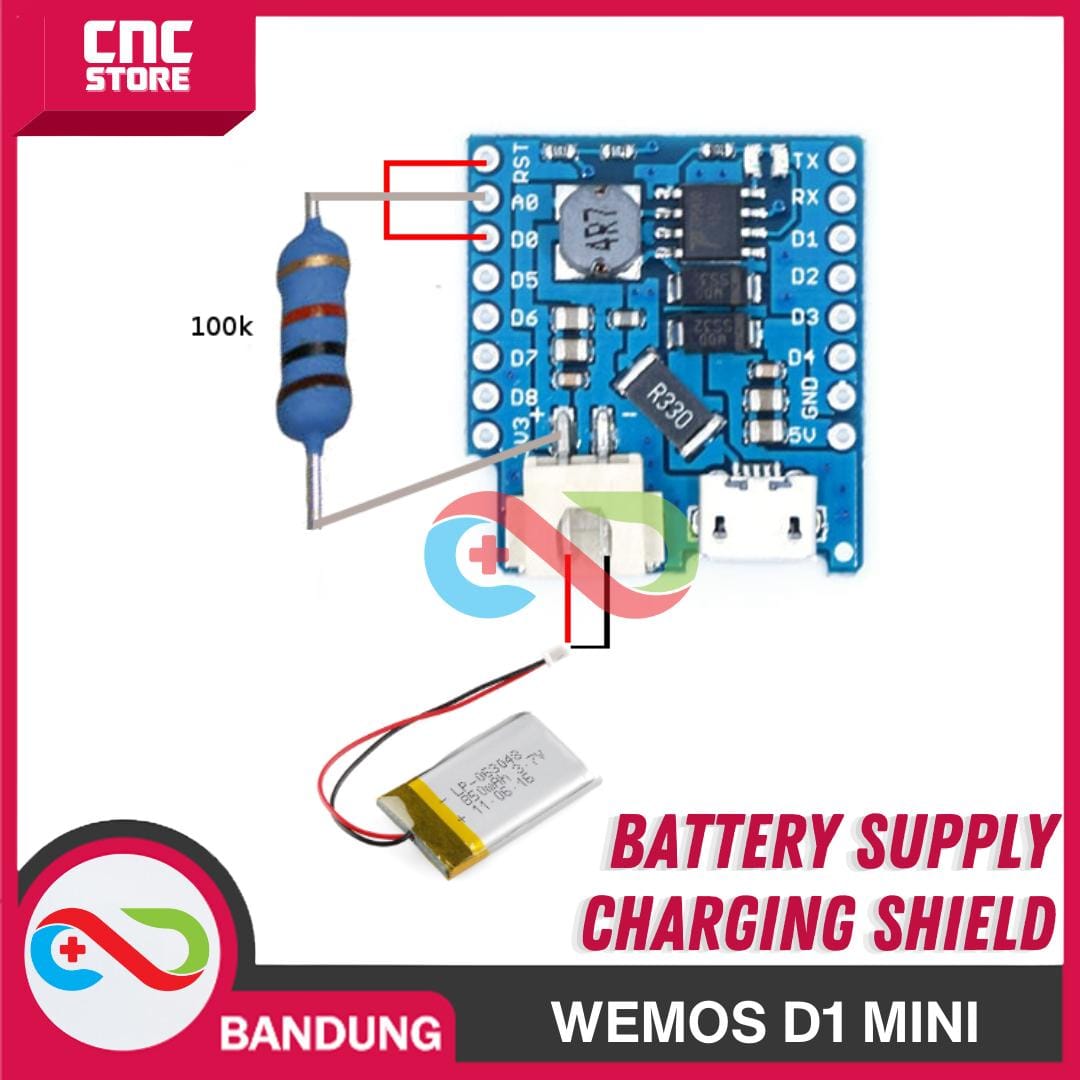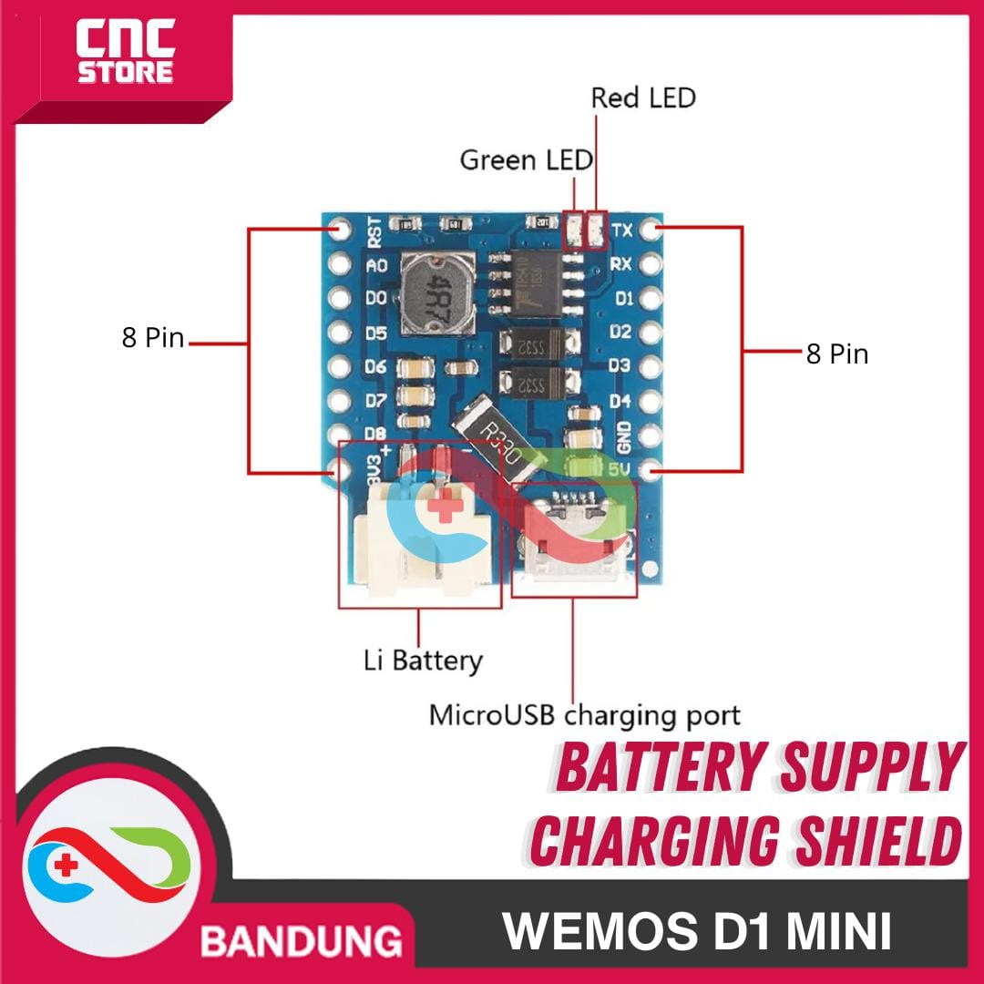 Dengan shield ini, anda bisa menggunakan baterai Lithium/LiPo untuk WeMos D1 mini anda. Shield ini mengatur tegangan baterai menjadi 5V (sesuai dengan Vcc WeMos D1 mini).