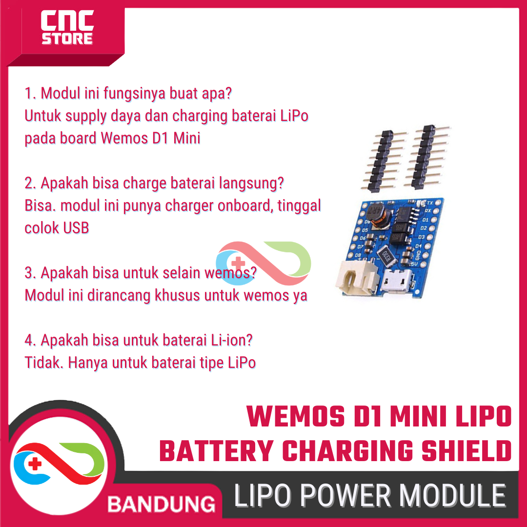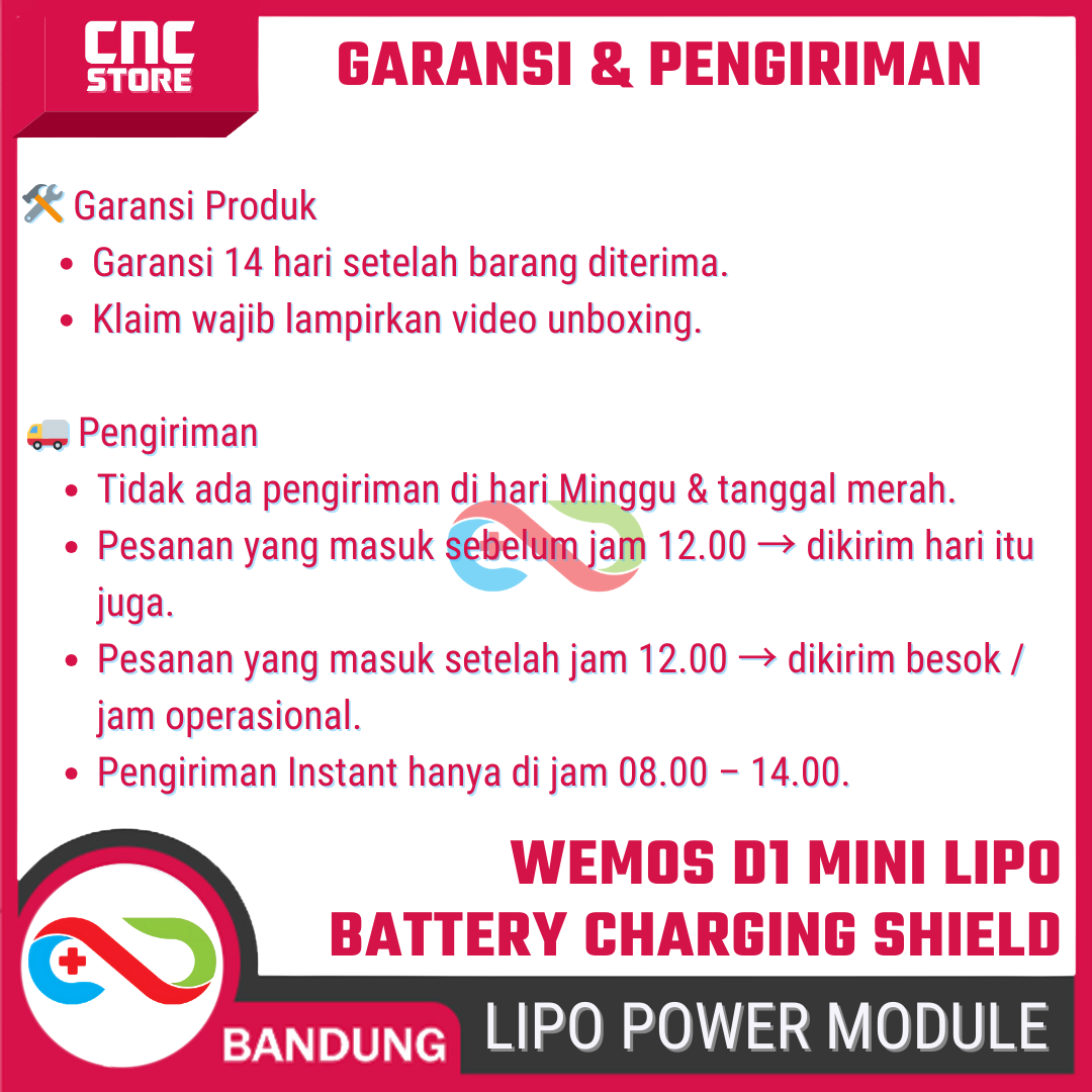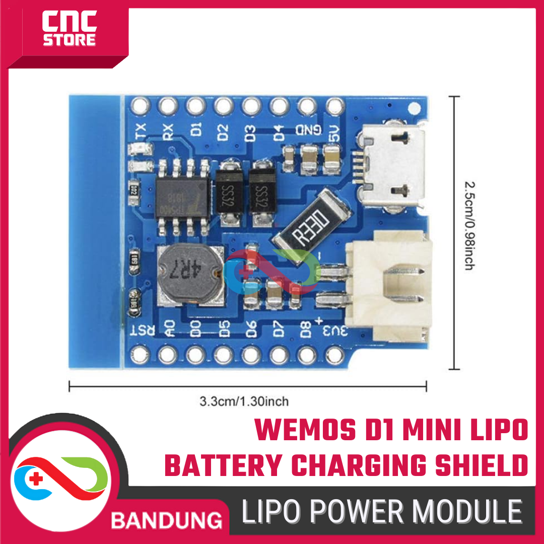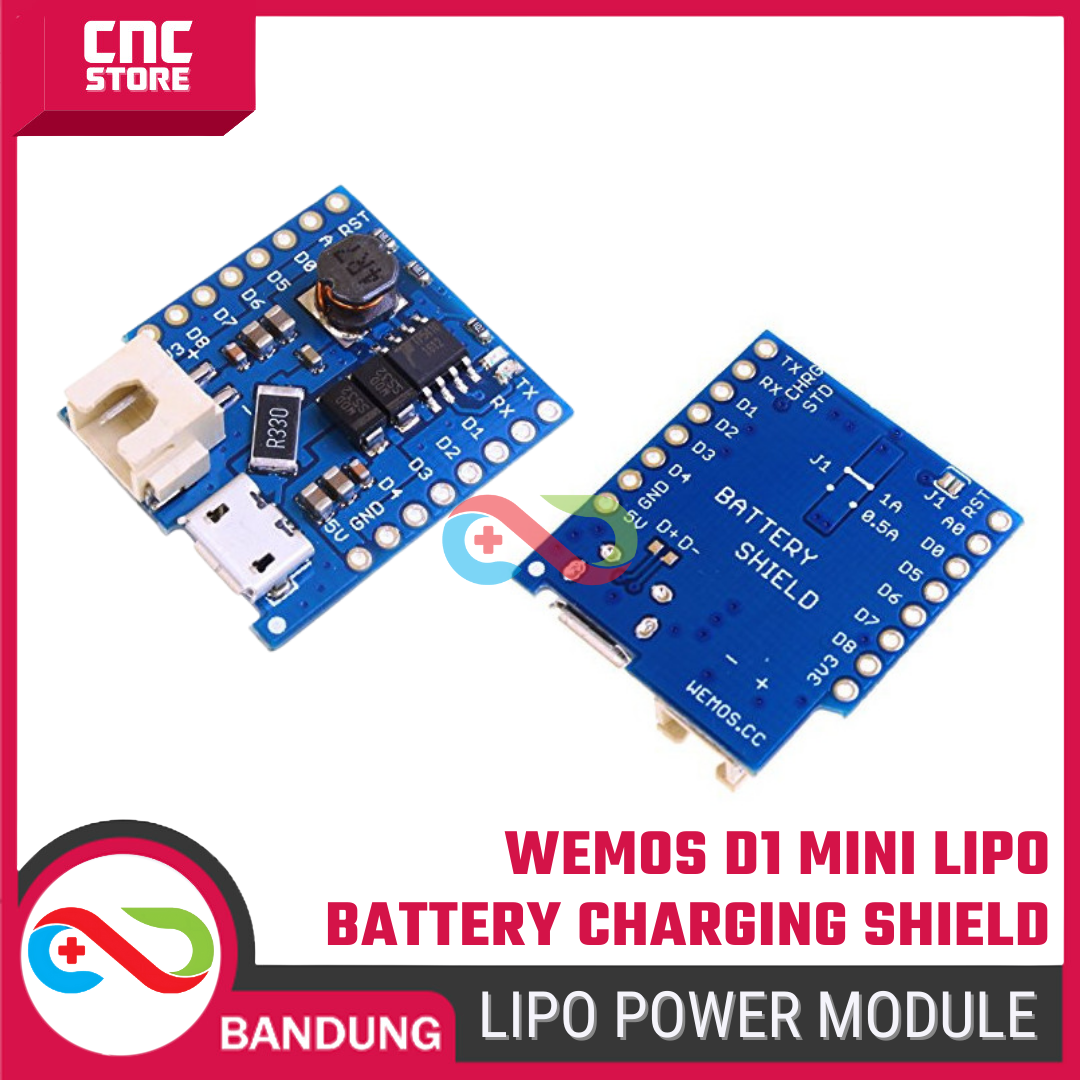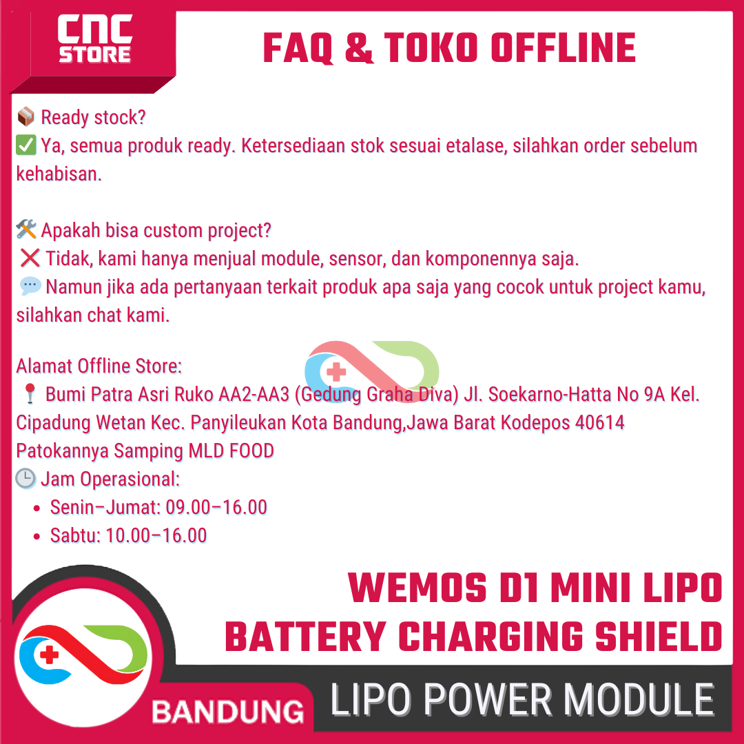 Wemos D1 Mini Lithium (LiPo) Battery Supply Charging Shield adalah shield khusus yang dirancang untuk mengubah Wemos D1 Mini menjadi perangkat portable, aman, dan siap jalan hanya dengan satu baterai Li-ion/LiPo (3.7V).