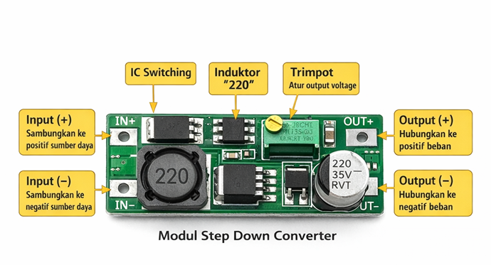 Step down converter adalah rangkaian elektronika yang berfungsi menurunkan tegangan DC dari level yang lebih tinggi menjadi lebih rendah. Artinya, tegangan output selalu lebih kecil daripada tegangan input. Misalnya: input 12V dari adaptor atau aki, lalu output diturunkan menjadi 5V atau 3,3V sesuai kebutuhan perangkat tanpa mengubah sumber dayanya.