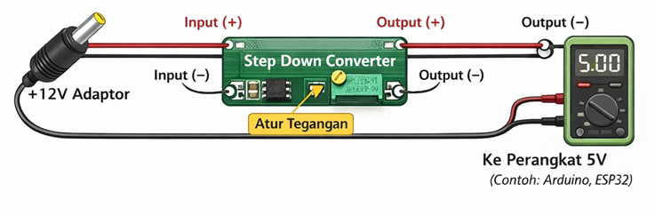 - Tentukan output mau berapa volt (contoh 5V untuk Arduino, 3,3V untuk ESP32, 9V untuk modul tertentu
