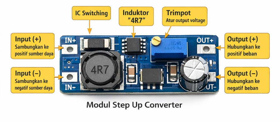 Step up converter adalah rangkaian elektronika yang berfungsi menaikkan tegangan DC dari level yang lebih rendah menjadi lebih tinggi. Artinya, tegangan output selalu lebih besar daripada tegangan input. Misalnya: Input 3,7V dari baterai lithium, output dinaikkan menjadi 5V atau 12V tanpa mengubah sumber dayanya.
