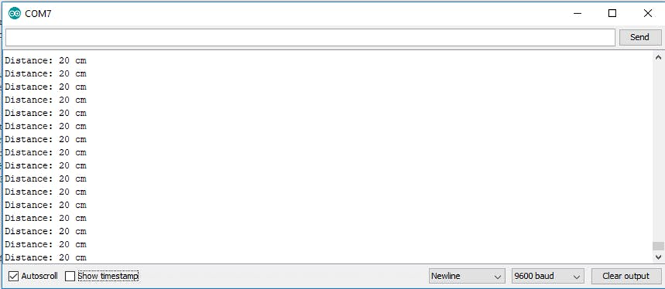 Sebagai pertimbangan, Anda dapat mengukur jarak secara manual dengan menggunakan penggaris dan membandingkannya dengan jarak yang ditampilkan di Serial Monitor.