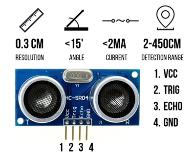 Pin konfigurasi HC-SR04 :VCC (1), TRIG (2), ECHO (3), dan GND (4). Tegangan suplai VCC adalah +5V dan Anda dapat menghubungkan pin TRIG dan ECHO ke I/O Digital apa pun di papan Arduino Anda.