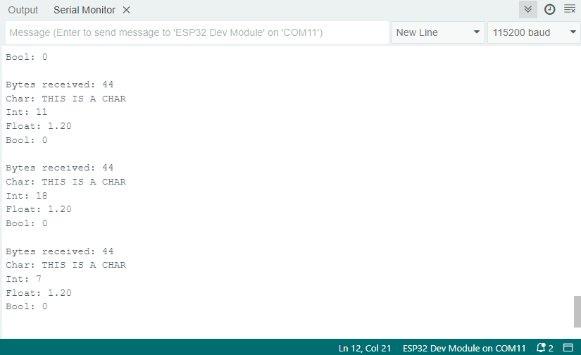 Now, the myData structure contains several variables inside with the values sent by the ESP32 sender. To access variable a, for example, we just need to call myData.a.