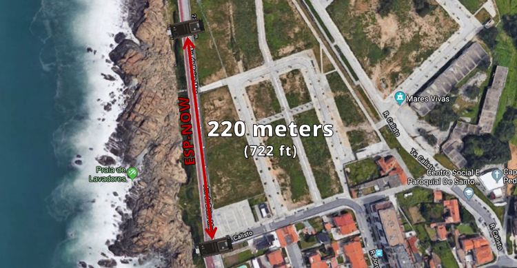 Kami menguji jangkauan komunikasi antara dua papan tersebut, dan kami berhasil mendapatkan komunikasi yang stabil hingga 220 meter (sekitar 722 kaki) di area terbuka. Dalam percobaan ini, kedua antena onboard ESP32 saling diarahkan satu sama lain.